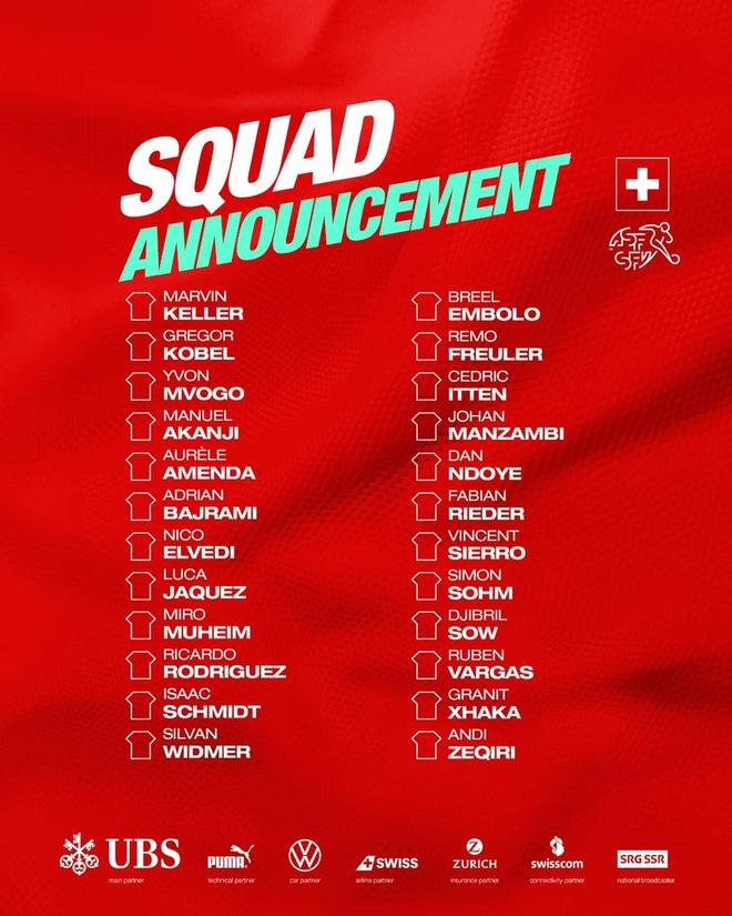 北京时间10月2日,瑞士国家队公布了10月国际比赛日的24人大名单,阿坎吉、科贝尔、扎卡在列。