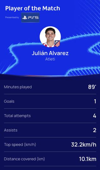 此役阿尔瓦雷斯搭档格列兹曼双前锋首发出场,在下半场补时阶段被换下,贡献1粒进球2记助攻,进攻端4次射门3次射正,1次过人全部成功,贡献5次关键传球,传球成功率90%。根据官方显示的数据,阿尔瓦雷斯本场比赛奔跑距离为10.1km,最高冲刺速度达到32.2km/h。