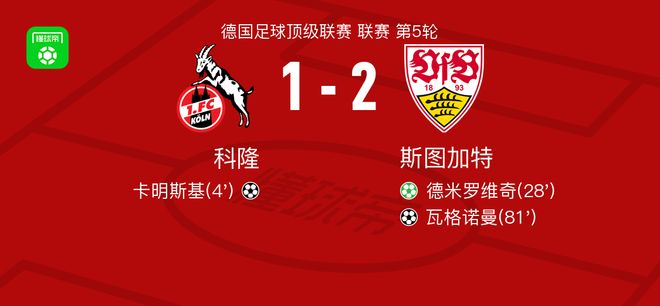 北京时间9月28日德国足球顶级联赛 联赛 第5轮,科隆主场对阵斯图加特。科隆卡明斯基破门。斯图加特德米罗维奇破门,瓦格诺曼破门。最终比分科隆 1-2 斯图加特。