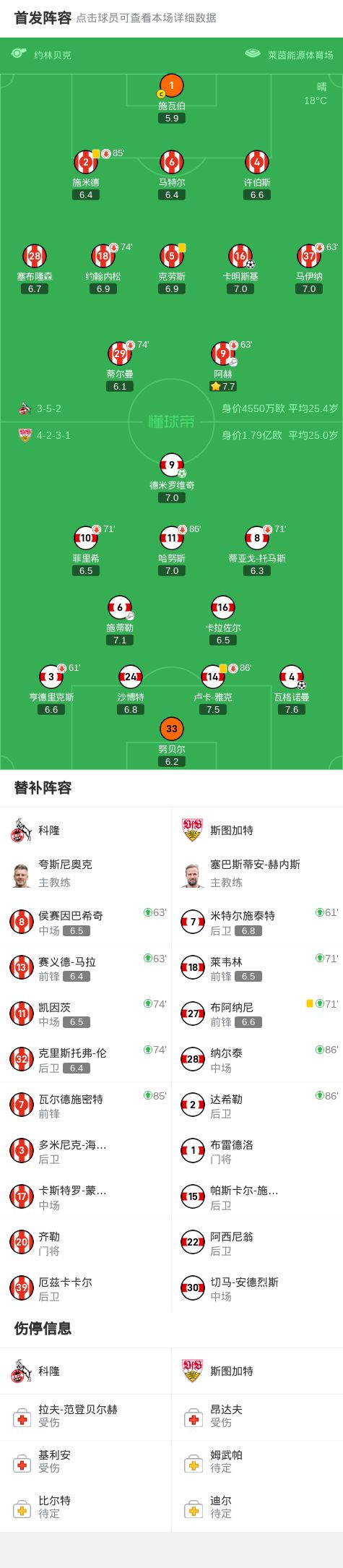 斯图加特2-1逆转科隆,瓦格诺曼建功,德米罗维奇点射破门