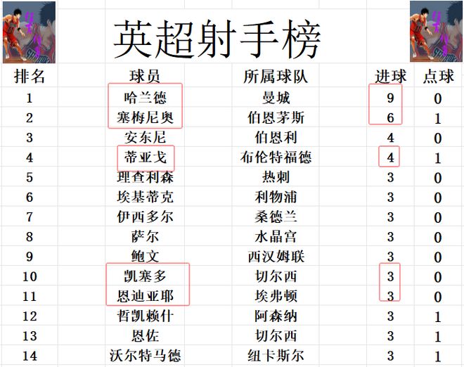 射手榜方面,哈兰德7轮打入9球,继续稳居榜首,塞梅尼奥6球排在第2,错失单刀的蒂亚戈还是和安东尼4球并列第3。恩迪亚耶,沃尔特马德今天进球后,追上凯塞多,埃基蒂克等人3球刚好挤入前十。