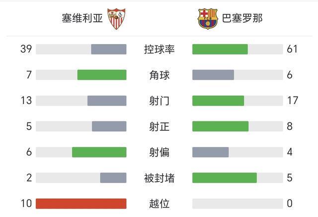 从全场数据来看,塞维利亚虽仅有39%的控球率,13次射门和5次射正,却是更具进攻威胁的一方。反观巴萨空有61%的控球率,17次射门有8次射正,却只转化为1粒进球!