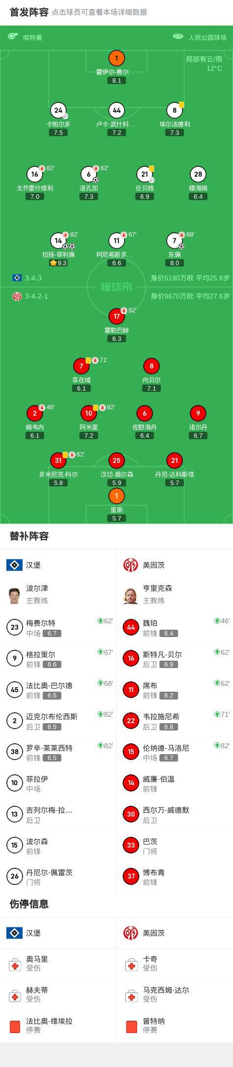 汉堡4-0大胜美因茨,拉扬-菲利佩两球,东佩建功