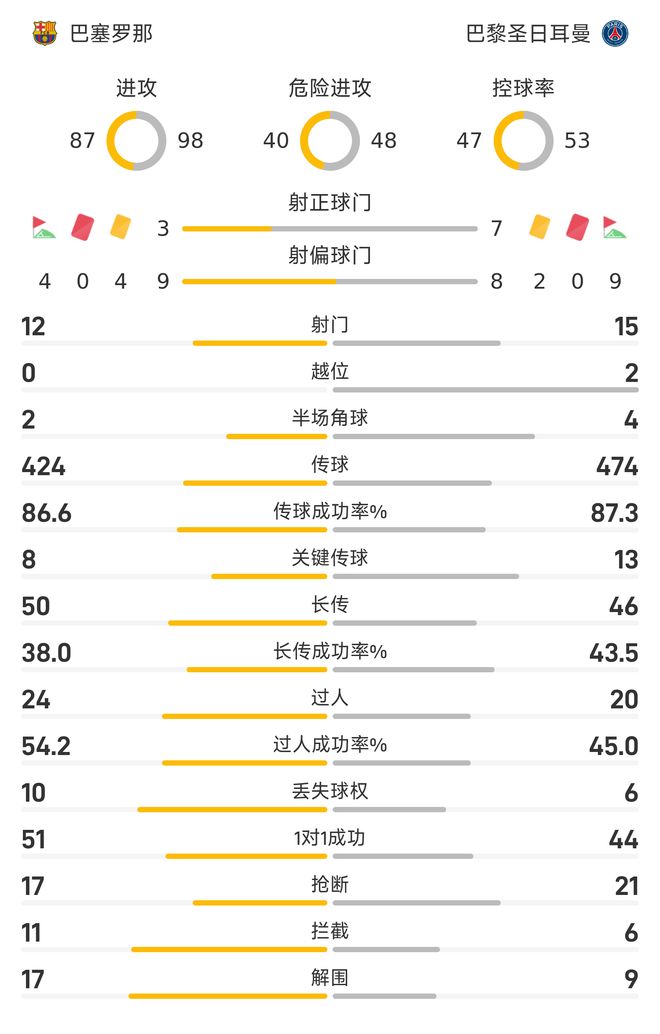 射正7-3遥遥领先!大巴黎创造机会、控球率等皆优于巴萨